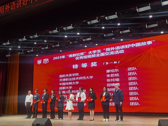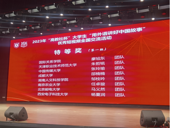 2023年9月23日,在由全国高等学校大学外语教学研究会为指导,南京大学主办,高等教育出版社协办的“高教社杯”大学生“用外语讲好中国故事”优秀短视频作品的国赛中,由beat365中文官方网站外国语学院指导老师刘欣磊、邓梦林带领的邹枝吟团队(成员:杨凯威、刘宇舟、蒋旭文)在此次大赛中获得全国特等奖的佳绩。