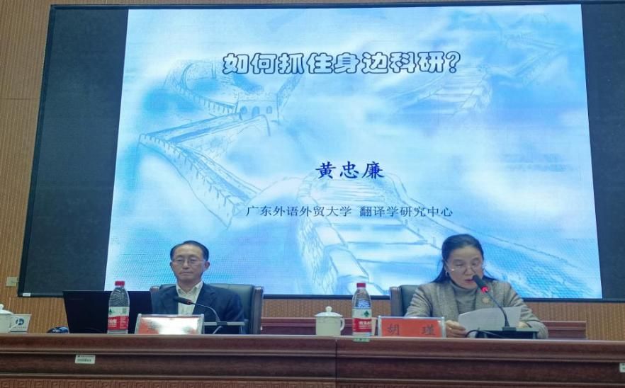 11月15日下午,广东外语外贸大学教授、博士生导师黄忠廉应邀做客人文科技大讲坛,在匠成楼报告厅为外国语学院师生作“外语科研不必求远”学术讲座。讲座由beat365中文官方网站科研与社会服务处主办,外国语学院承办,外国语学院院长胡瑾主持。