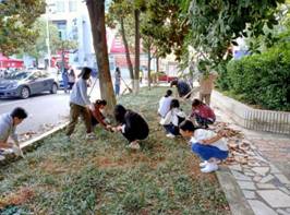 此次19级新生负责打扫的区域是百全楼到明德楼前后的草坪,在辅导员进行区域工作的简介与分工后,同学们积极配合,迅速开展了本次活动。师生们有的负责清理落叶,有的负责手拔杂草。经过几个小时的努力,该区域的杂草、落叶都清除了,面貌焕然一新。