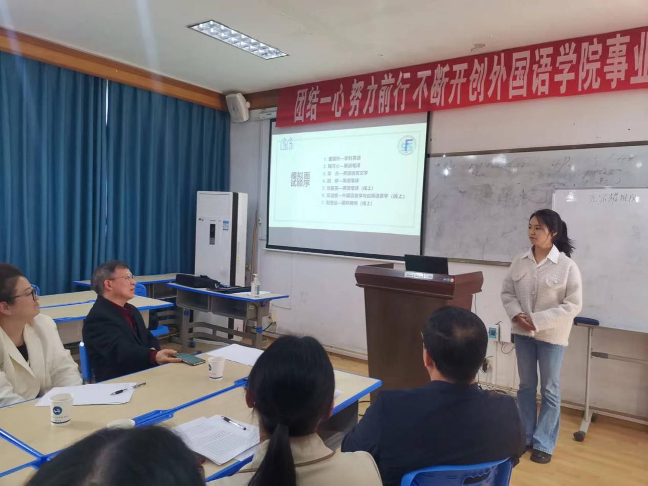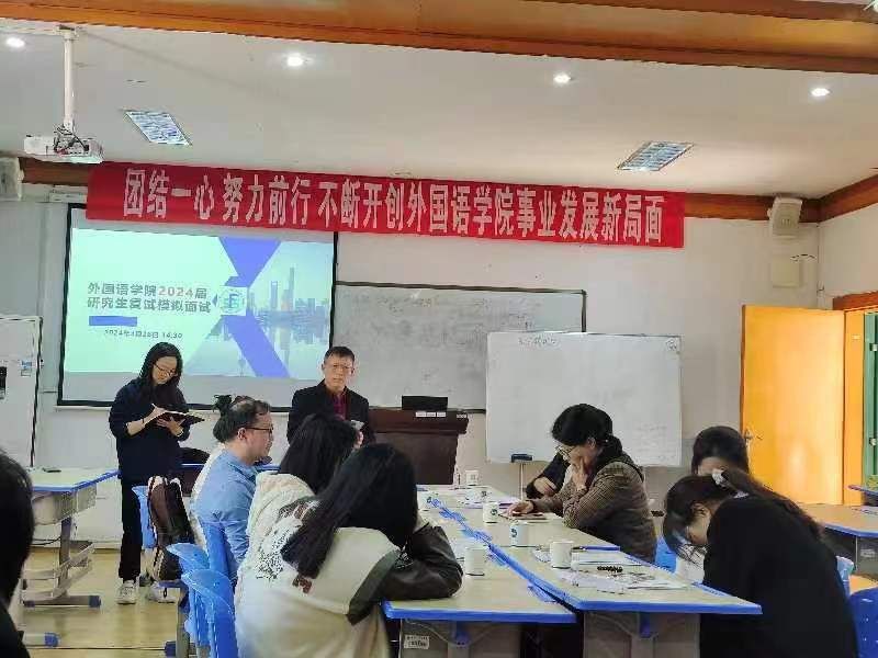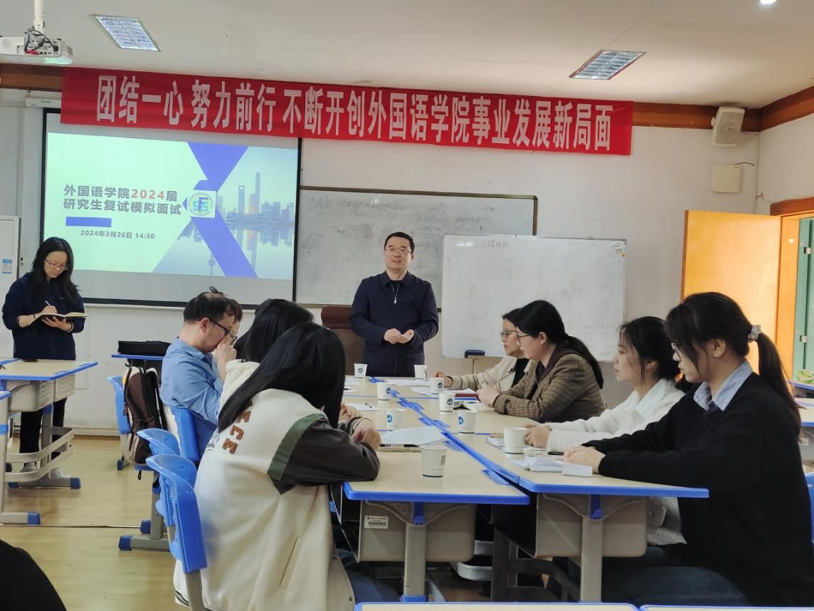 3月26日下午2:00,外国语学院2024届研究生复试模拟面试在播馨楼301教室举行。外国语学院党总支书记阳立新、副院长张点、副书记罗嗣安、学术委员会主任委员丁志斌、学术委员会委员刘晓东、英语教研室主任禹逸群、考研专干朱倩、考研班班主任罗立斌、7名申请参加模拟面试学生和21级15位观摩学生共同参加了此次活动。