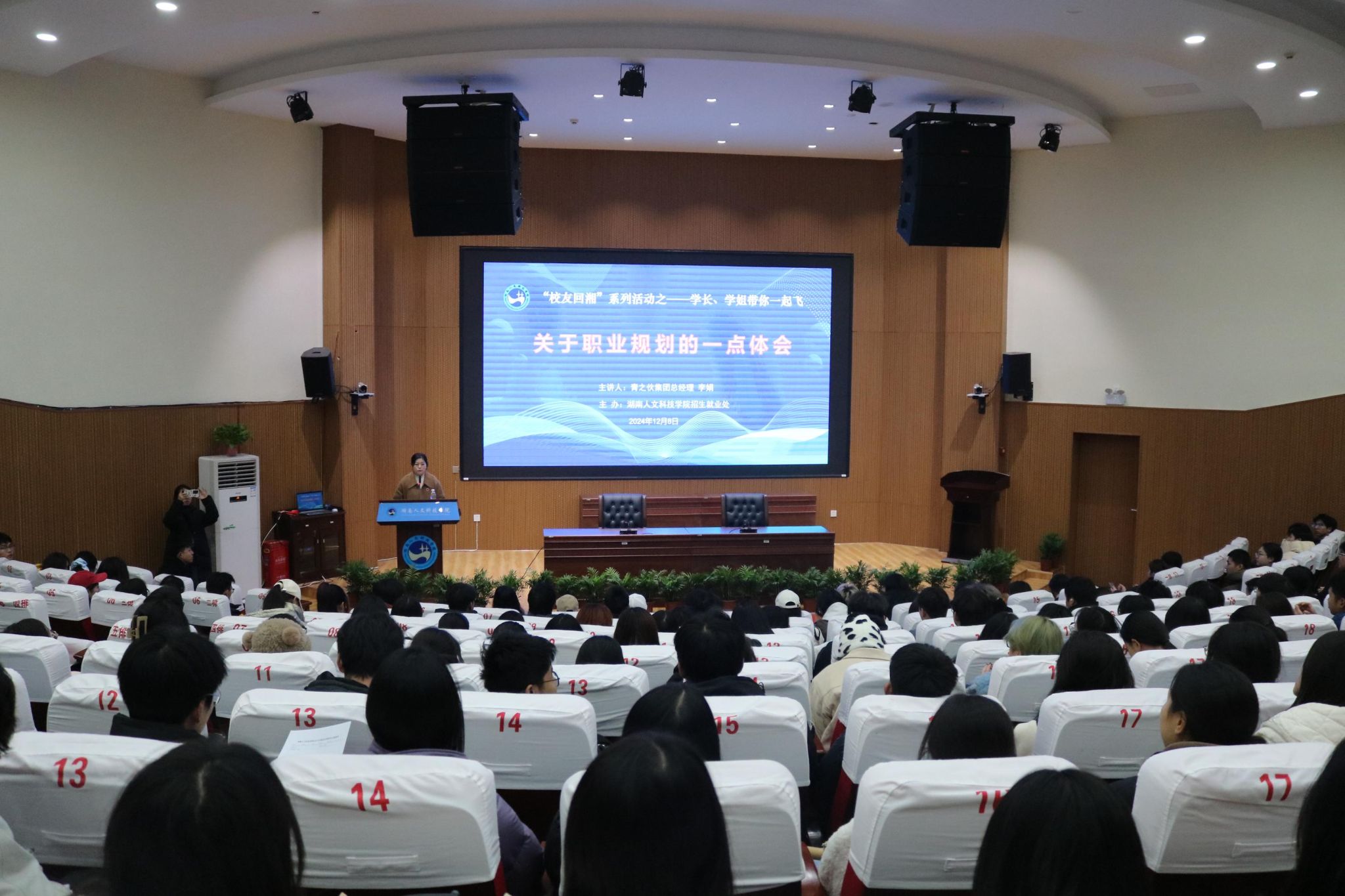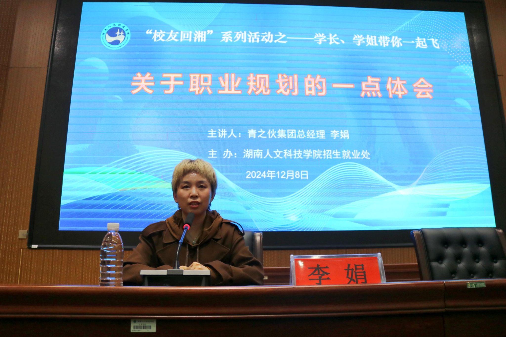 12月8日晚,beat365在匠成楼报告厅举行了大学生职业生涯规划分享会。beat3652004级外国语学院经贸英语专业优秀校友、青之伙集团总经理李娟女士受邀返校,为学弟学妹们做关于职业规划的主题分享。招生就业处处长刘红燃、轩路国际咨询公司总经理李小科女士、长沙校友会秘书长彭扬女士出席活动,各二级学院近300名学生代表参加。活动由招生就业处副处长陈佩君主持。