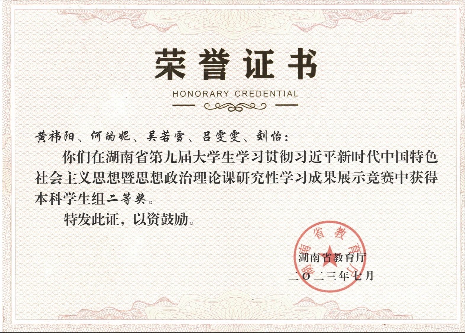 2023年7月获湖南省第九届学习贯彻习近平新时代中国特色社会主义思想暨思想政治理论课研究性学习成果展示竞赛中本科学生组二等奖