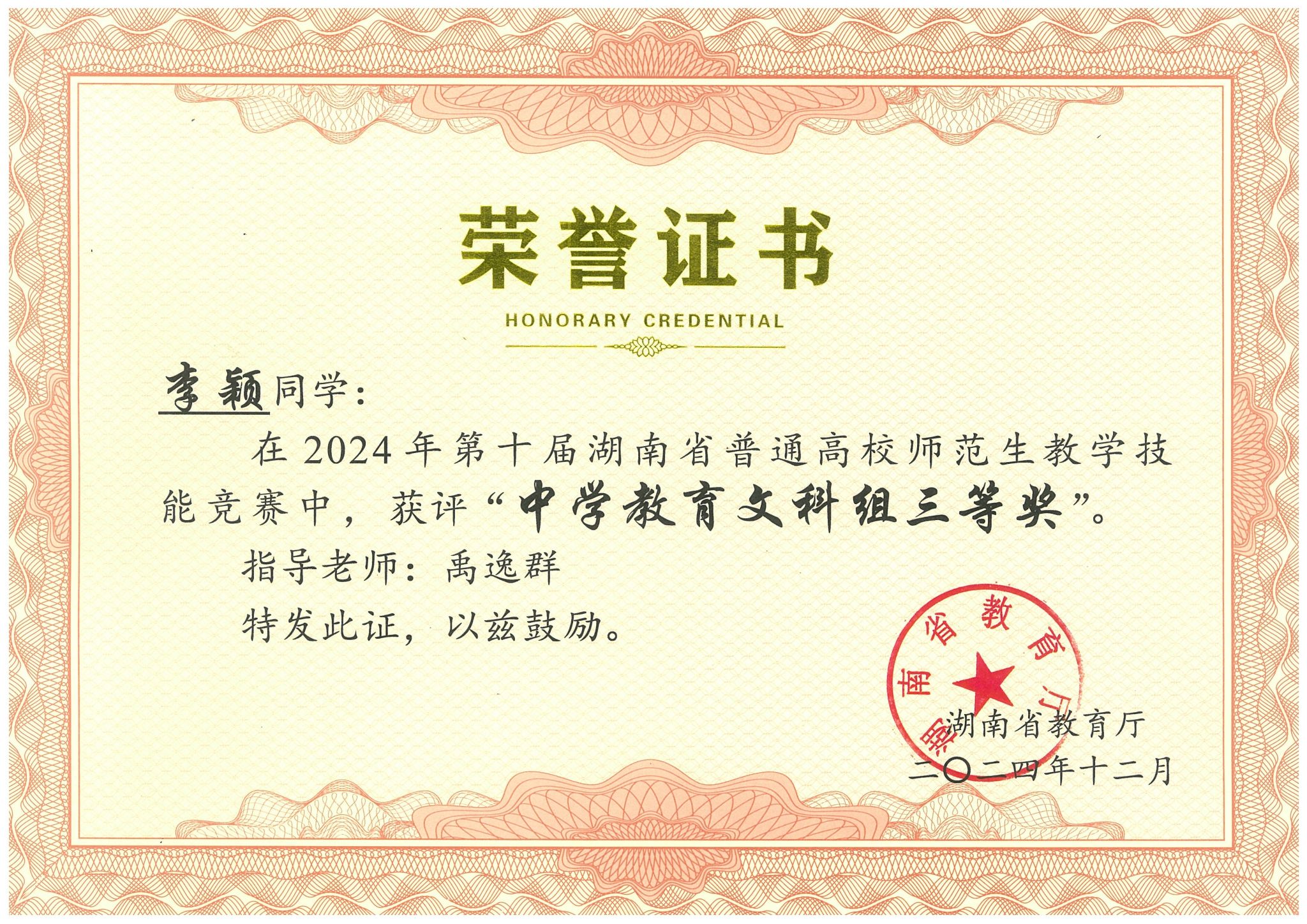 2024年11月获湖南省第十届师范生技能大赛“三等奖”