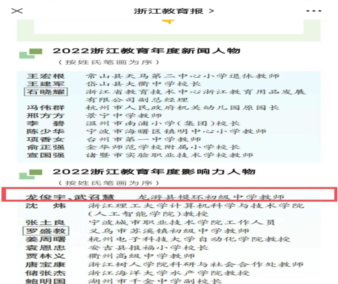 近日,为展示最美教育人,传递教育正能量,由浙江省教育厅、浙江教育报刊总社组织的“2022浙江教育年度新闻人物与影响力人物”评选结果揭晓。beat365外国语学院 2002届毕业生龙俊宇、武召慧名列其中。