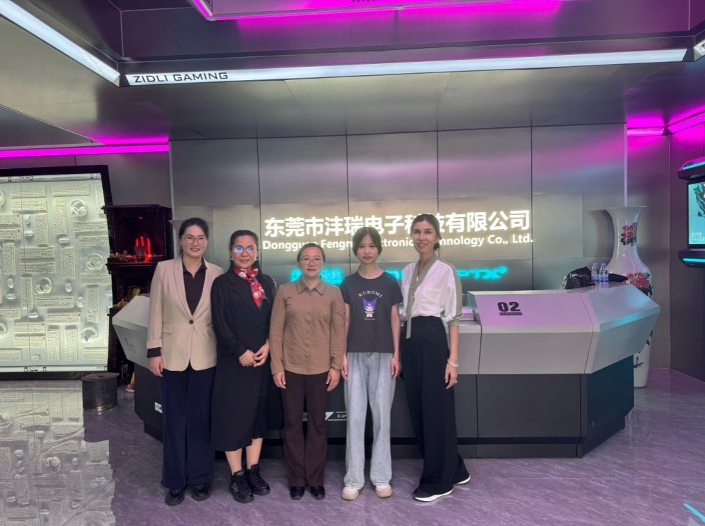 11月17日,一行人首先走访了东莞沣瑞电子科技有限公司。公司董事谢利霞女士首先介绍了企业发展历程及核心业务布局,公司具体产品包括游戏耳机、键盘、鼠标等电竞外设设备,产品远销欧美、东南亚等20余个国家和地区,对具备跨文化沟通能力、熟悉国际贸易规则及行业术语的外语人才需求迫切。随后,外国语学院党总支书记李霞、专业带头人胡瑾教授详细介绍了学院专业设置、人才培养特色及毕业生就业方向,重点展示了商务英语专业在“外语+行业”复合能力培养上的探索,如开设国际贸易实务、跨境电商运营等课程,组织学生参与国际展会翻译实践等成果。双方围绕人才培养方案优化、实习基地建设、毕业生定向输送等议题展开深入讨论,达成多项合作共识并签订协议。