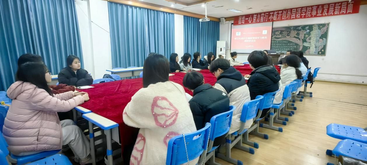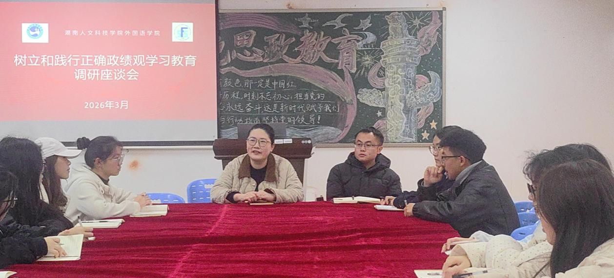 为深入开展树立和践行正确政绩观学习教育,坚守“以学生为中心”的工作理念,畅通师生沟通渠道,切实倾听学生发展诉求、解决学生急难愁盼问题, 2026年3月10日下午,外国语学院在播馨楼301召开“凝心聚力促发展 倾听心声共成长”学生干部工作调研座谈会。学院党总支副书记罗嗣安、团总支书记满英杰、团学会主席及部长参加会议。