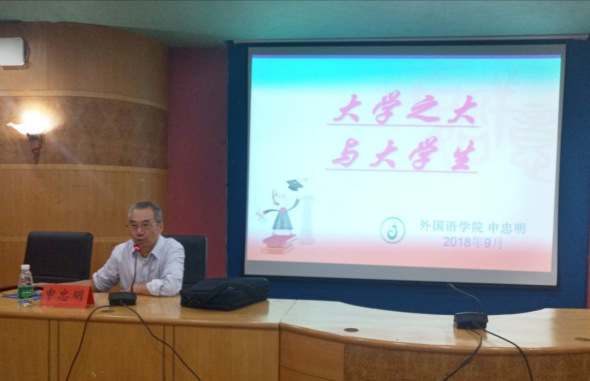 9月26日晚,外国语学院党总支书记申忠明教授在养根楼报告厅为我院18级全体新生做了一场题为“大学之大与‘大学生’”的主题讲座。