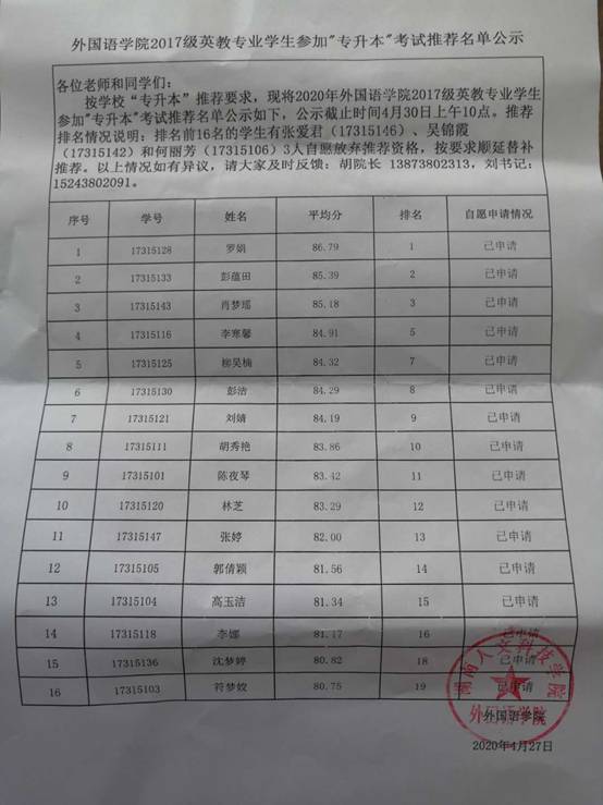 外国语学院2017级英语教育专业学生参加“专升本”考试推荐名单公示