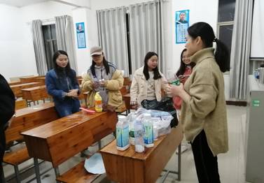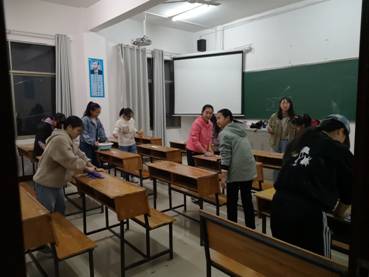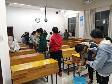 1125日,外国语学院学工办朱倩老师在组织19级学生会干部开展清理“课桌文化”活动时,发明的课桌清洗液有奇效。