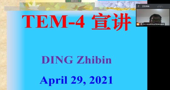 429,我院学术分委员会主任丁志斌教授(博士)通过腾讯会议开设了2021TEM考前宣讲报告会,外国语学院2017(部分)2018(部分)2019300余名学生聆听了此次在线宣讲。报告会由英语教研室主任禹逸群老师主持。