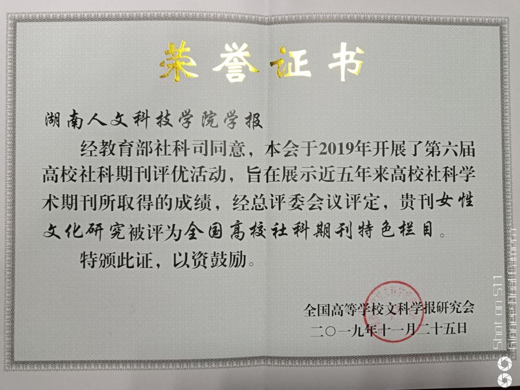 “女性文化研究”被评为全国高校社科期刊特色栏目