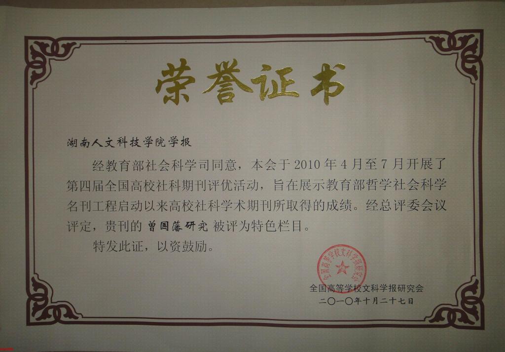 2010年10月27日,全国高等学校文科学报研究会第四届评优活动总结评比大会在西南大学召开,会上公布了全国高等学校文科学报研究会第四届评优结果。beat365学报蝉联全国高校百强社科期刊,学报“曾国藩研究”专栏被评为全国高校社科期刊特色栏目。