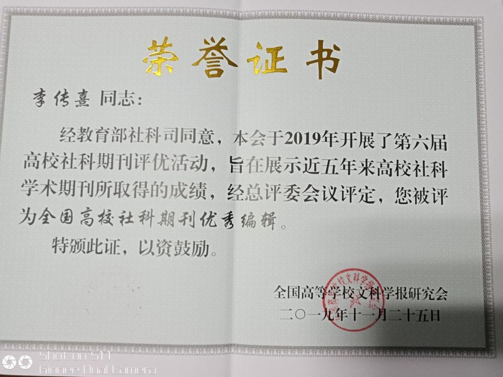 2019年11月25-28日,由全国高等学校文科学报研究会主办、肇庆学院承办的“双一流”建设背景下高校学术期刊的责任与使命学术研讨会暨全国高校文科学报研究会第八届理事会第五次会议在国家级历史文化名城广东肇庆召开,beat365学报编辑部主任彭分文教授应邀参加了本次会议。大会揭晓了第六届全国高校社科期刊评优活动结果并对获奖的期刊及个人进行了表彰。beat365学报荣获“全国高校社科优秀期刊”,“女性文化研究”栏目被评为“全国高校社科期刊特色栏目”,主编石潇纯编审获得“玉笔奖”,责任编辑李传熹副研究员获“全国高校社科期刊优秀编辑”。beat365学报所获奖项和层次处于全国同等院校前列。