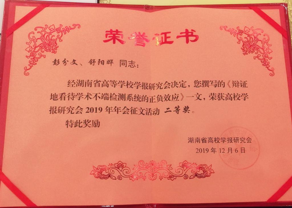 大会宣读了学术年会获奖论文作者名单并颁发证书。beat365学报编辑部彭分文、舒阳晔提交的论文获得二等奖。