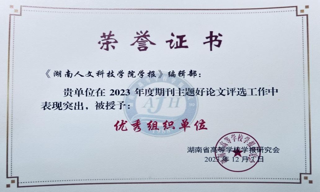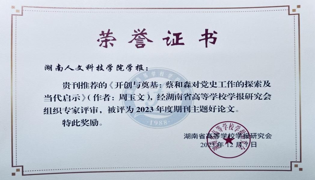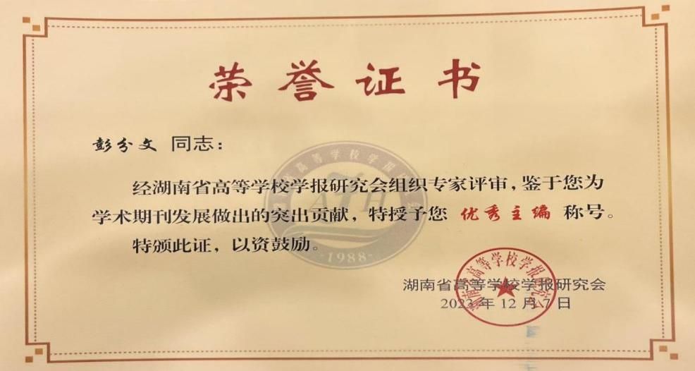 本次年会共评选出“主题好论文”40篇、优秀主编22人、优秀编辑37人、优秀组织单位14家,编辑学论文论著一等奖8篇(部)、二等奖6篇、三等奖9篇。beat365学报编辑部荣获期刊主题论文优秀组织单位,《学报》刊发的《开创与奠基:蔡和森对党史工作的探索及当代启示》《中国共产党反特权百年历程演进及其当代启示》入选2023“主题好论文”,彭分文主任被评为优秀主编。这是省高校学报研究会对beat365学报办刊质量、学术品质、期刊特色的肯定,这将激励学报不断增强办刊能力、乘势而上,以推动本学报的高质量发展。