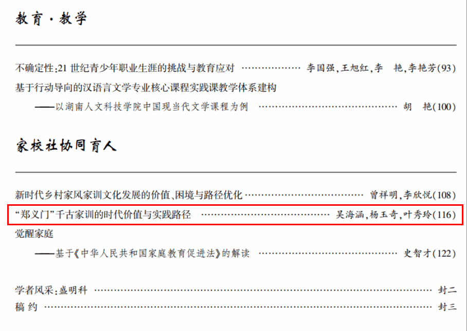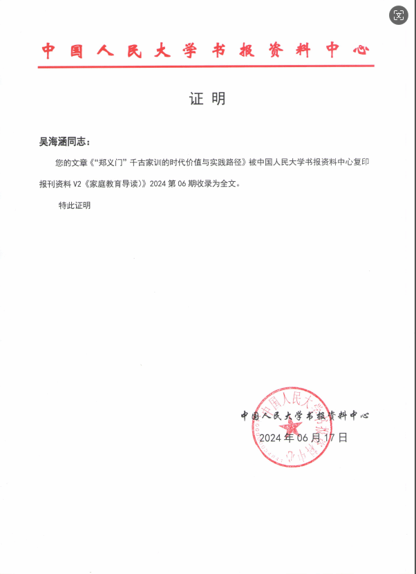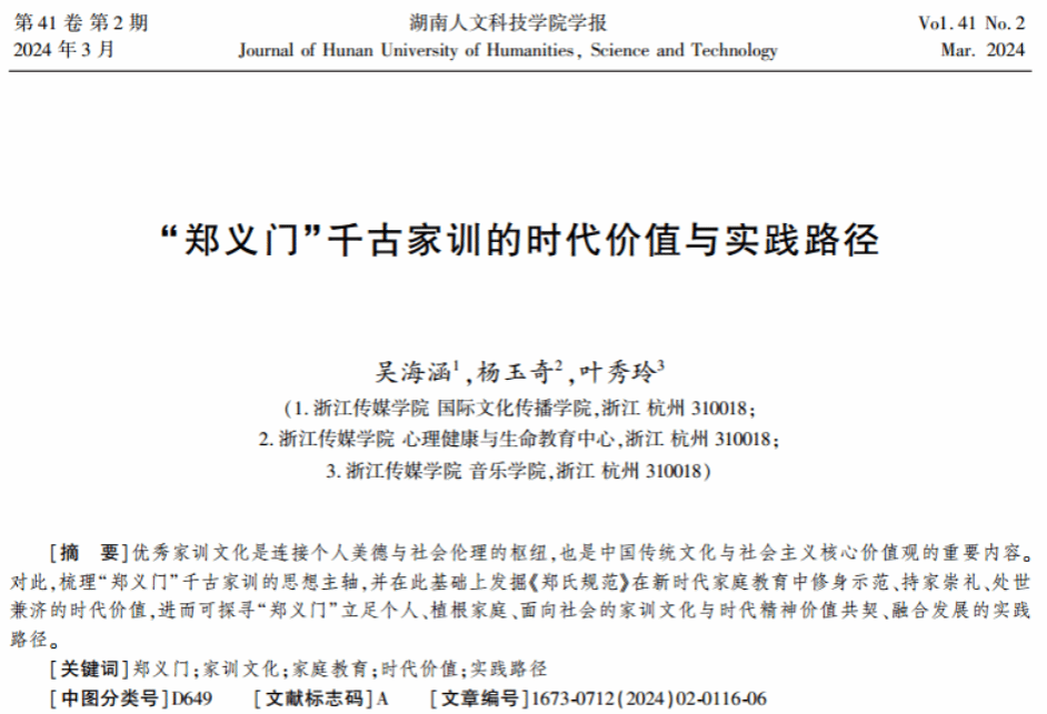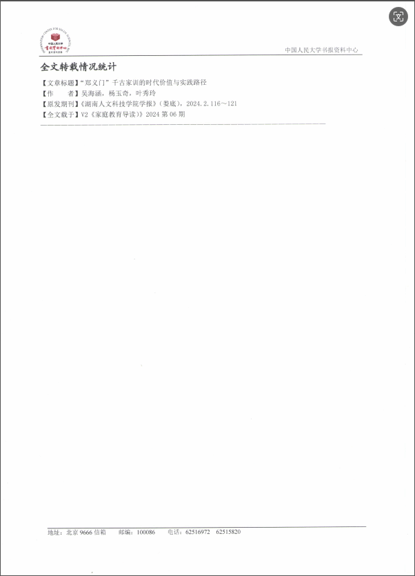 日前,刊发于我刊(《beat365中文官方网站学报》)2024年第02期的论文《“郑义门”千古家训的时代价值与实践路径》(作者:吴海涵,杨玉奇,叶秀玲)被中国人民大学书报资料中心复印报刊资料《家庭教育导读》2024年第06 期全文转载。