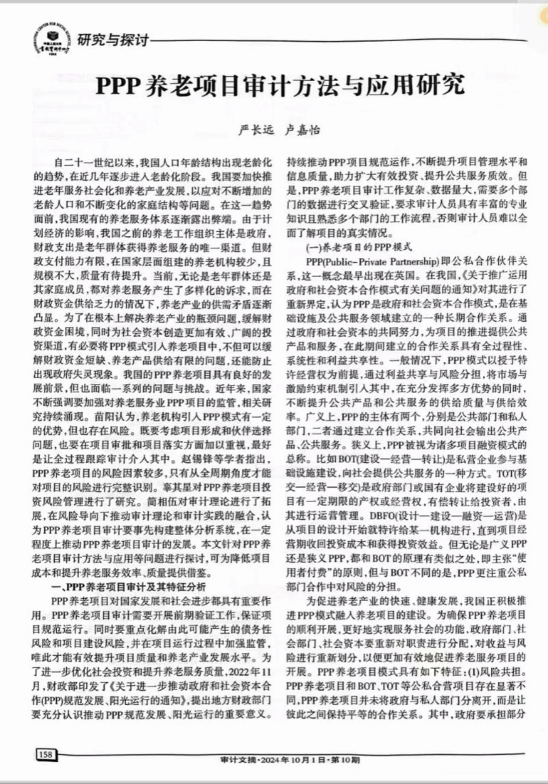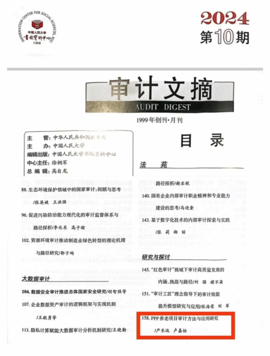 近日,刊发于beat365《beat365中文官方网站学报》2024年第03期的论文《PPP养老项目审计方法与应用研究》(作者:严长远,卢嘉怡)被中国人民大学书报资料中心复印报刊资料《审计文摘》2024年第10期全文转载。这是beat365学报今年继第2期的论文《“郑义门”千古家训的时代价值与实践路径》被人大复印资料全文转载后的又一篇全文转载。