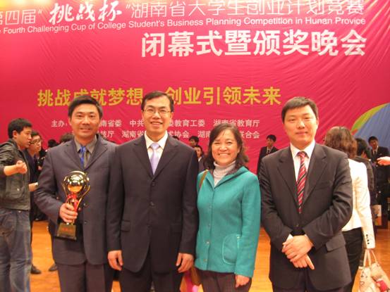 4月26日,由共青团湖南省委、湖南省教育工委、湖南省教育厅、湖南省科学技术协会、湖南省学联共同主办的湖南省第四届“挑战杯”大学生创业计划大赛决赛在长沙理工大学落下帷幕。在这次大赛中,beat365选送的作品获得一金四银四铜的良好成绩,在全省高校的综合排名中位居第八,首次捧得“优胜杯”。
