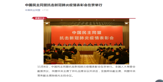 2020年11月08日,中国民主同盟抗击新冠肺炎疫情表彰会在京举行。全国人大常委会副委员长、民盟中央主席丁仲礼出席会议并讲话,全国政协副主席、民盟中央常务副主席陈晓光主持会议。