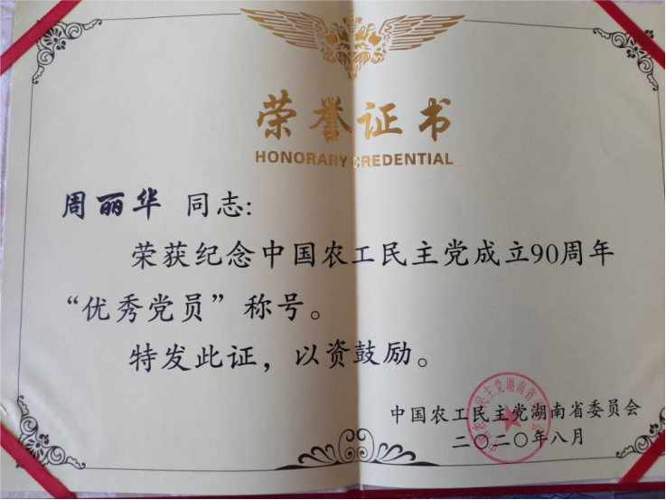 8月9日,农工党湖南省委会召开中国农工民主党成立九十周年纪念大会。会上表彰了一批先进市(县)级组织、先进基层组织和先进个人,beat365农工党beat365中文官方网站支部荣获农工党湖南省委会“先进基层组织”荣誉称号;主委周丽华荣获“优秀党员”荣誉称号。