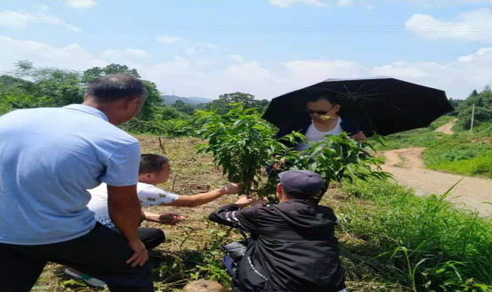 专家服务团队顶着炎炎烈日翻山越岭来到位于石井村的娄底市石井生态种养有限公司经果林基地。公司负责人先介绍了基地的基本情况,目前公司流转土地200多亩,已引种怀化锦绣黄桃3000株,试种面积近100亩,西瓜种植面积近70亩。随后,专家服务团队一行来到果林基地田间地头,现场实地查看果木情况,仔细观察黄桃林长势后,康林峰指出,整片黄桃林看上去长势喜人,苗木实则已经受到“梨小食心虫”虫害的侵袭,并拿出刚采摘来的枝头剥开示范如何辨识,然后从防治农药的作用机理、用药时间节点、用药量、次数做了细致入微的讲解,同时对水肥管理、修枝造型、果园后期管理进行了指导,并对公司今后引种品种提供了参考建议。李红建从提升技能,助力乡村振兴角度谈了自己的看法,并建议公司利用毗邻娄底市区的区位优势,在发展采摘体验、观光旅游等方面做好文章,做出自己的品牌特色。