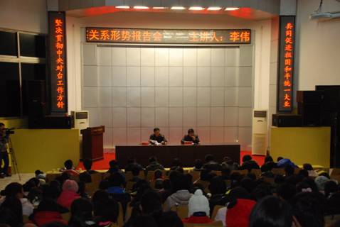 李伟智围绕台海关系主题作了精彩的演讲。他指出台湾问题由来已久、错综复杂,其实质是中美之间的博弈。李主任从台湾的基本情况、中央的对台方针政策、马英九其人及马英九时代台湾的政治、经济特点,当今两岸交流的新形势、新格局等四个方面全面介绍和分析了台海关系及其发展走势。他以丰富的学识、风趣的讲演为师生们上了生动一课并得到了听众的一致好评。