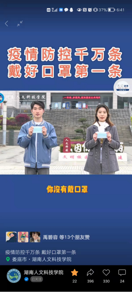 方案一确定,全体党员立即行动,在短时间内选定了演员,设计好了拍摄脚本,看好了天气,准备好了拍摄服装、设备等,选定了几个最佳拍摄地点。最后,在党支部全体党员的配合下,加班加点顺利完成了拍摄和后期制作等工作。两个防疫短视频通过学校官方视频号、官微发布,在网络上广为流传,朋友圈有刷屏,得到了全校师生的一致好评。手势舞视频还上了“湖南教育发布”官方微博,起到了很好的防疫宣传效果。