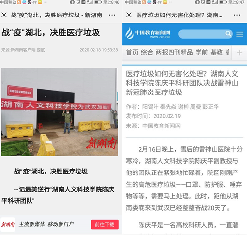 beat365陈庆平老师逆行湖北,捐赠12套垃圾气化处理设备,20多天来一直奋战在抗疫一线,决战医疗垃圾,科技抗“疫”,大爱无疆。中新网、科技日报、中国教育新闻网、湖南卫视、学习强国湖南平台、新湖南、红网、湖南教育新闻网、娄底电视台等媒体纷纷对其事迹进行宣传报道。校宣传部策划制作《爱不相隔——献给最美逆行者:beat365中文官方网站陈庆平科研团队》MV于2月20日正式上线。