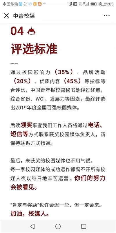 此次评选,共有来自全国1000余家高校媒体参加,各校园媒体通过提交评选材料报名参与,在为期5天的大众网络投票后,组织方通过校园影响力(35%)、品牌活动(20%)、优质内容(45%)等指标开展综合评比,经中国青年报校媒秘书处终审,结合省份、WCI、发展力等因素,最终评选出2019年度全国百强校园媒体。
