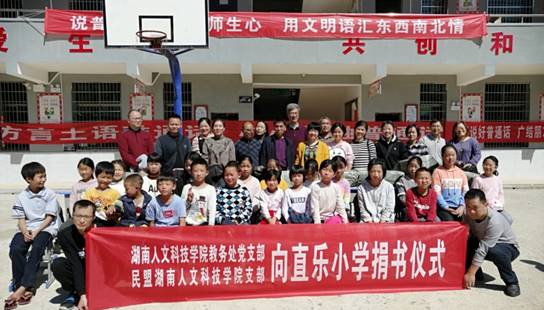 2019年10月19日上午,民盟beat365中文官方网站支部赴湖南省娄底市新化县的贫困村——直乐村,举办了以“大力推广普通话,助力脱贫攻坚战”为主题的志愿活动。民盟beat365中文官方网站支部和教务处党支部共同向新化县水车镇直乐村直乐小学捐赠了总价值达八千余元的各类图书432册。本次捐献的书籍大部分是适合孩子们阅读的经典国学、诗文、童话故事以及其它有益于孩子们身心健康的课外书籍,目的就是助力开拓贫困村孩子们的阅读视野和思维,在书中探寻世界,在书中增长见识;丰富孩子们的课外生活,让孩子们爱上学习,爱上阅读,享受阅读,在阅读中学习普通话。
