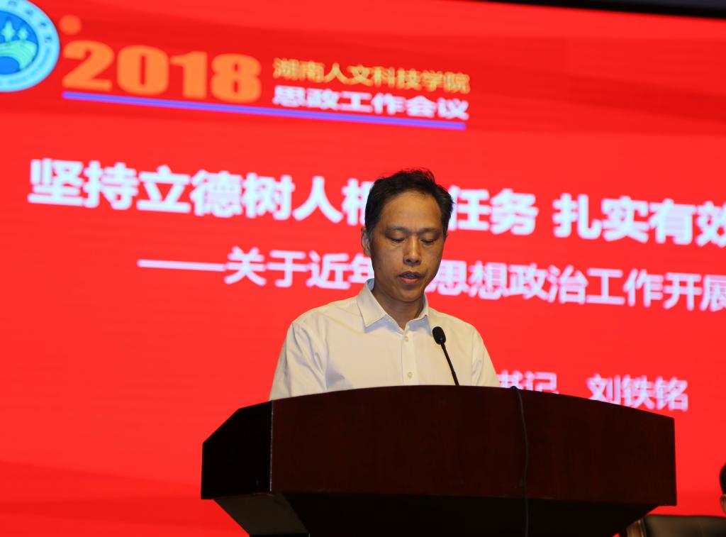 党委副书记刘铁铭以《坚持立德树人根本任务、扎实有效开展思政工作》为题,从学习贯彻上级精神、理论教育、价值引领、马克思主义学院建设、师德师风及队伍建设、宣传文化载体建设、文明创建、实践育人、党的领导等方面全面总结了学校近年来开展思想政治工作的基本情况、主要成效及存在的问题。