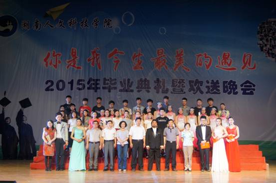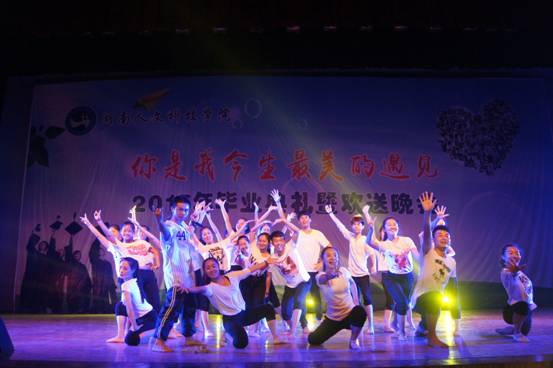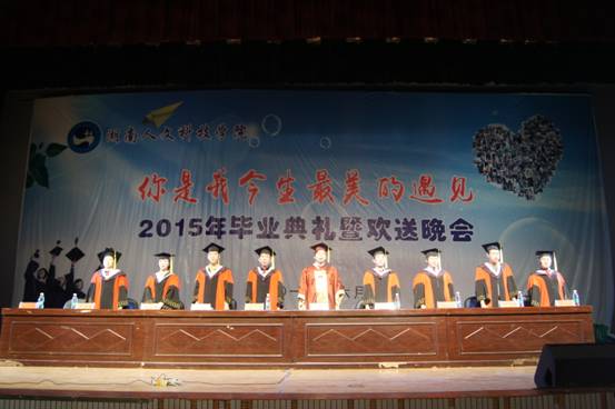 随后,主题为“你是我今生最美的遇见”2015年毕业欢送晚会在视频——《青春四年》中温情拉开序幕。活力四射的舞蹈《给力青春》充满了对大学生活的青春回忆,街舞《我们毕业了》、拉丁秀《时光不老,我们不散》激情豪迈,将现场气氛推向了高潮。每个人的心中都有一份毕业情结,优秀创业校友音舞系施东成、教育系杨畅也带来了祝福,诗朗诵《请不要在桥上休憩》、特邀湖南歌舞剧团的校友余蒙一曲《感恩》表达了对母校难以割舍的深情,《老师,我想你》传递着浓浓的感激与不舍。在采访互动环节,刘红燃老师含泪深情祝福,毕业生集体向老师献花并拥抱话别的瞬间湿润了大家的眼睛。最后,群舞《再见青春》完美谢幕了2015届毕业生的大学时代。