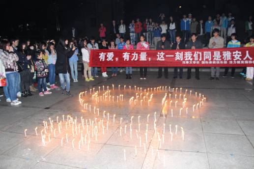 4月24日晚20:30,beat365许多同学聚集在海园广场,点亮蜡烛,在烛光下为逝者默哀,为生者祈福,为雅安祈福。同学们高喊“雅安加油!我们在一起!”,现场气氛庄严肃穆,大家神情显得非常凝重。一根根泛着温暖的蜡烛在地上围成心形,一只只孔明灯缓缓升向天空,寄托着人文学子的祝福。同学们纷纷在展板上写下自己对雅安人民诚挚的祝愿,希望能籍此传递给雅安人民力量和温暖,祝福雅安人民早日度过难关。