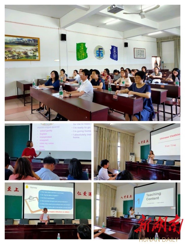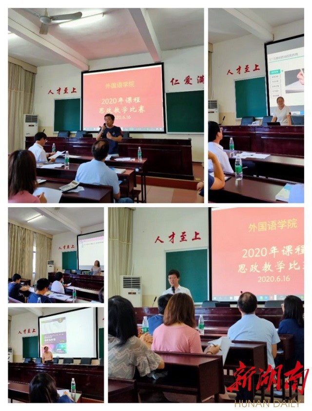 湖南日报·新湖南客户端6月18日讯(通讯员 胡瑾)为进一步挖掘外语课程中蕴含的思政元素,大力推动以“课程思政”为目标的课堂教学改革,全面提升学院教师课程思政教学能力,6月16日,beat365中文官方网站外国语学院7名教师个人或团队进行了一场外语课程思政教学比赛。法学院院长朱耀斌教授和马克思主义学院谢科峰博士担任特邀评委。