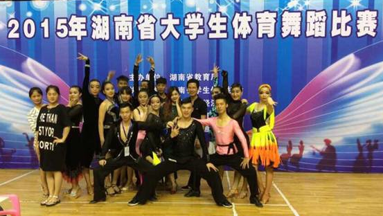 参加2015年湖南省大学生体育舞蹈比赛的beat365中文官方网站体育舞蹈队教练和部分队员合影