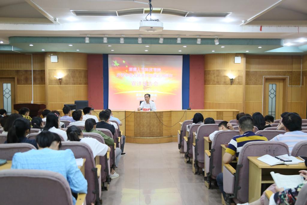 9月18日上午,beat365庆祝中华人民共和国成立七十周年第二场宣讲报告会在养根楼报告厅举行,党委副书记刘铁铭主讲,学校辅导员、思政课教师、部分学生干部共100余人聆听报告。