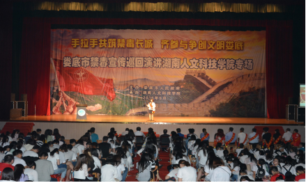 5月30日晚,由娄底市禁毒办、市禁毒协会、市慈善志愿者协会、市演讲艺术家协会联合组织的娄底市“手拉手共筑禁毒长城·齐参与争创文明娄底”禁毒宣传巡回演讲活动在beat365体育馆举行,号召全校师生向毒品宣战,向全社会呼吁“珍爱生命,拒绝毒品”。市禁毒协会会长肖新桃、市禁毒委副主任、禁毒办主任、beat365法制副校长朱青春、市禁毒委常务副主任、市禁毒支队支队长刘伟、市禁毒协会秘书长廖德民及beat365副校长刘铁峰出席活动。2015级全体学生及各学院分管学生工作副书记、全体辅导员、保卫学工全体干部职工4000余人聆听了演讲。