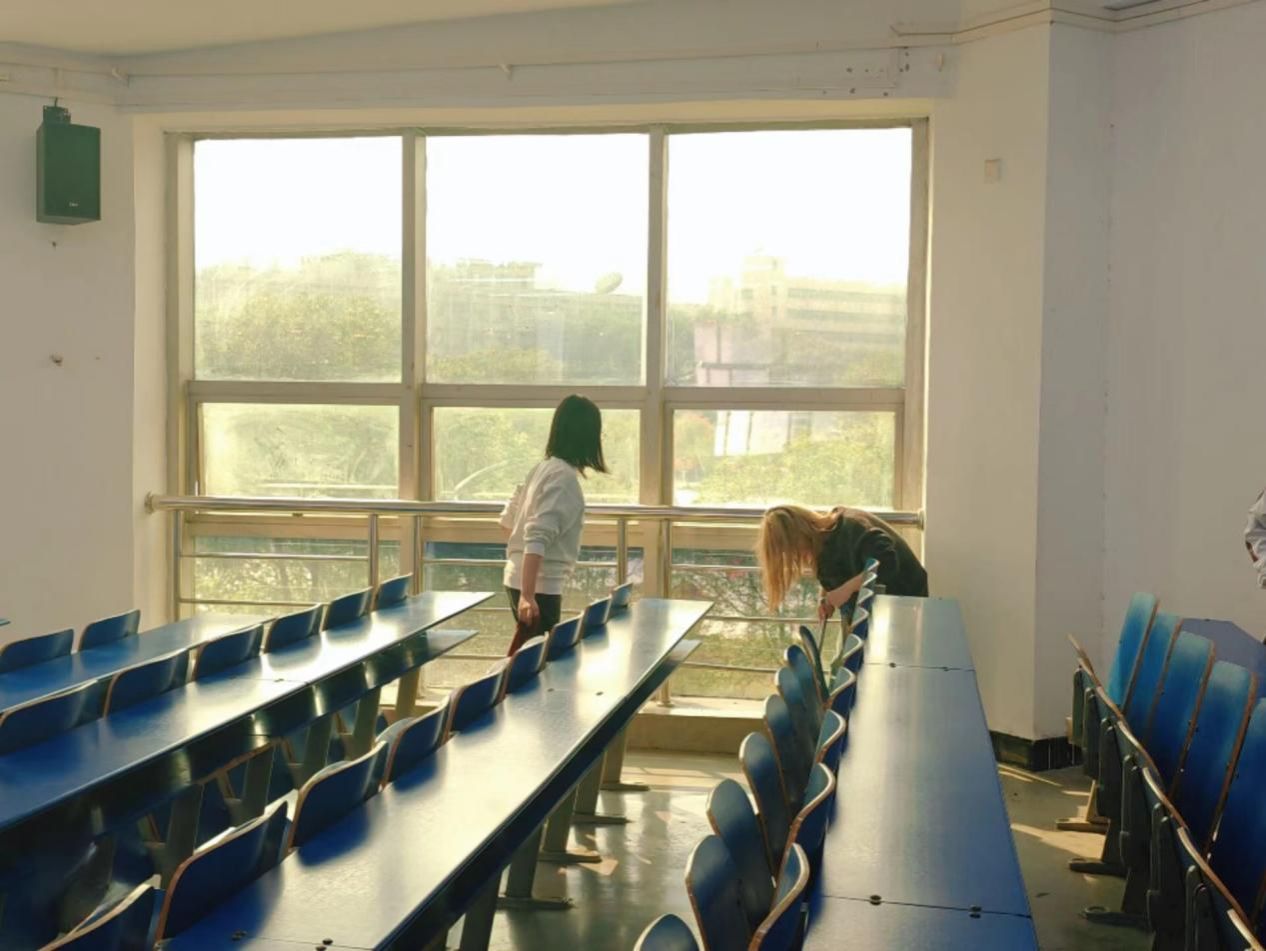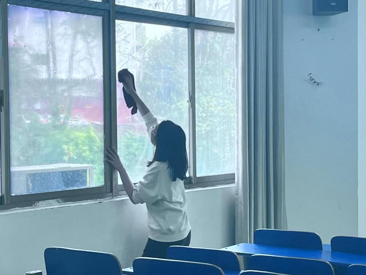 活动期间,全体志愿者们分工明确、各司其职,积极主动参与到大扫除行动中,对教室的办公桌椅、门框、地面、墙面、玻璃窗等进行了无死角清扫。虽然已至冬日,但学生干部的热情俨然驱散了寒冷,经过一个小时的打扫,公共教室焕然一新。