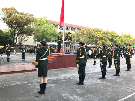 6:50分,国旗护卫队队员迈着整齐而庄严的步伐护送国旗入场。伴着激昂的国歌,五星红旗徐徐上升。在场的每一个人向国旗肃立敬礼,深怀对祖国无限的热爱和崇高的敬意。