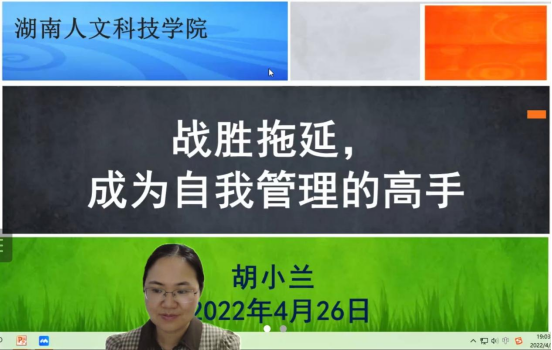 2022年4月26日,beat365心理健康教育教师、二级心理咨询师胡小兰老师为学生作“战胜拖延,成为自我管理的高手”线上专题讲座。此次讲座由beat365中文官方网站学生工作处,湖南省高校优秀思想政治工作者项目—心理健康教育宣讲团队联合举办。