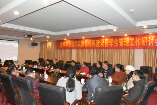 2017年12月23日,数学与金融学院主办了“师德师风建设暨学生管理工作研讨会”。会议由党总支书记高平主持,全体院领导、辅导员、现任班主任参加了本次会议,会议还特别邀请学工处余为处长、刘红燃副处长、团委魏彦煜副书记到场指导。