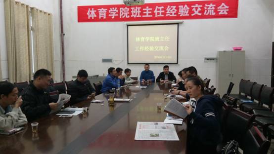 11月1日下午三点半,体育学院班主任工作经验交流会在体育馆会议室隆重召开。本次交流会是在我院全面推进学生管理工作的同时,为了进一步加强班主任队伍,提升广大班主任对学生管理工作重要性的认识,提升班主任的工作水平而召开的一次重要会议。蒋毅书记,谢嘉副书记,全体辅导员和班主任老师参加了此次会议。