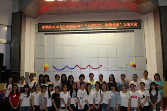 2016年5月31日晚7点30分,商学院成长辅导系列活动之—“心有阳光,拥抱幸福”女生大会在匠成楼报告厅隆重举行,出席本次会议的有商学院党总支副书记刘红燃,辅导员梁丹,丁剑,欧阳纯晶,谢丽老师,12级、13级优秀学姐代表,以及我院15级全体女生。