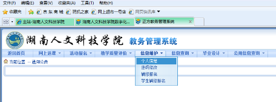 3、进入教务管理信息系统后,点击页面上方菜单中的“信息维护”,然后再点击本菜单条中的“个人信息”。