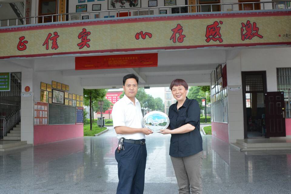 图为夏永全一行与校友们合影并赠送母校纪念瓷盘。