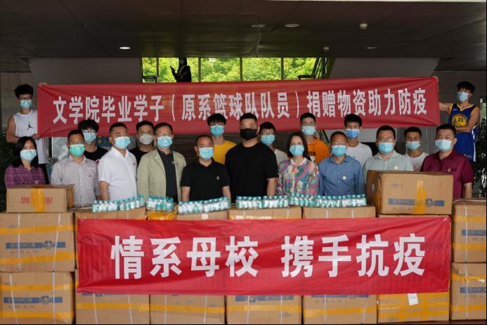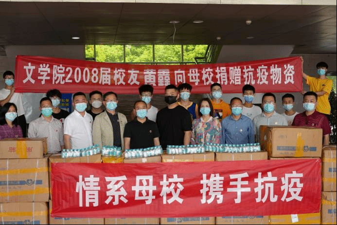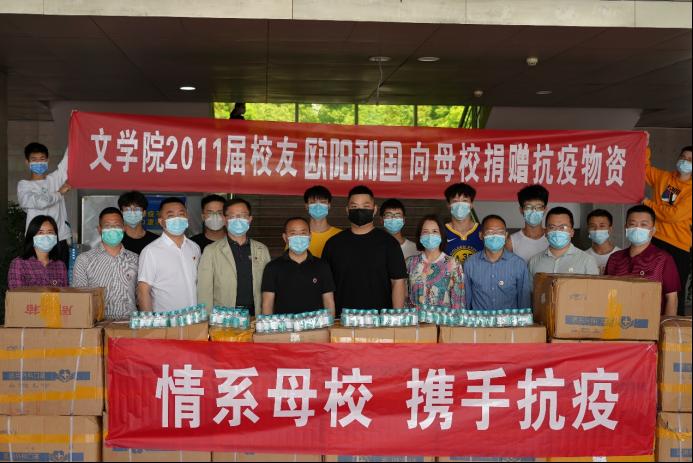 在全国上下齐心协力抗击新冠肺炎疫情之际,学校的疫情防控形势也牵动了校友们的心。4月11日上午,文学院校友捐赠的三批总价值5万元左右的抗疫物资送抵学校,校友们用拳拳真心表达着对母校的牵挂和支持。党委委员、副校长、学校疫情防控工作领导小组常务副组长刘铁峰代表学校接收捐赠,校友代表刘毅、党政办主任易俊、校友办主任刘莉、文学院党政班子成员及师生代表参加捐赠仪式。