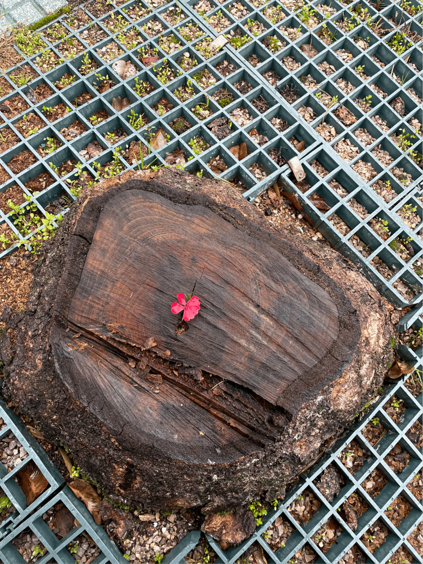 春天,在学校东门进来的路上,看到小树桩上孤零零开着朵小花,虽树桩已截断,小花却顽强生长,有种别样生机。