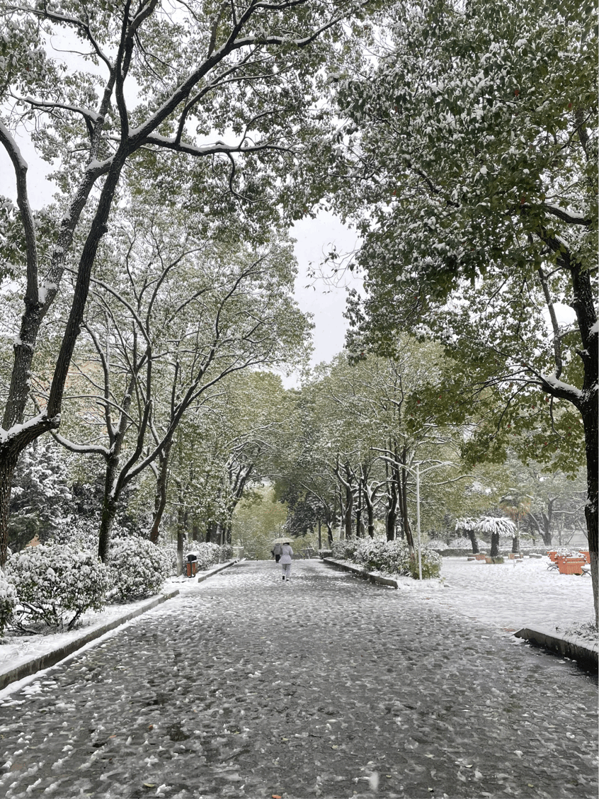 冬天,播馨楼与匠成间的小路积满了雪,有人撑伞走过,四周安安静静。