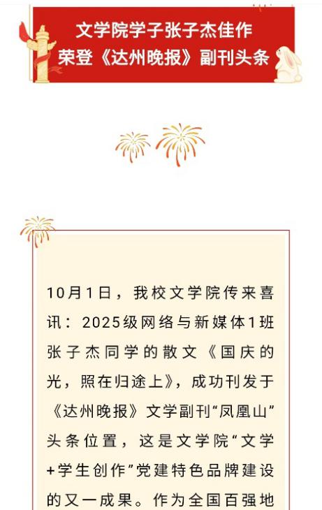 “子杰同学,你在征文比赛获得了全校第一名哦!你可真棒呀!”室友点开学校官网的新闻页面,指尖轻触屏幕,将那段详尽的介绍推至我眼前。我凝神细读,字字句句反复映入眼帘,心头的疑云却愈发浓重——这竟是真的?只见,上面赫然写着: