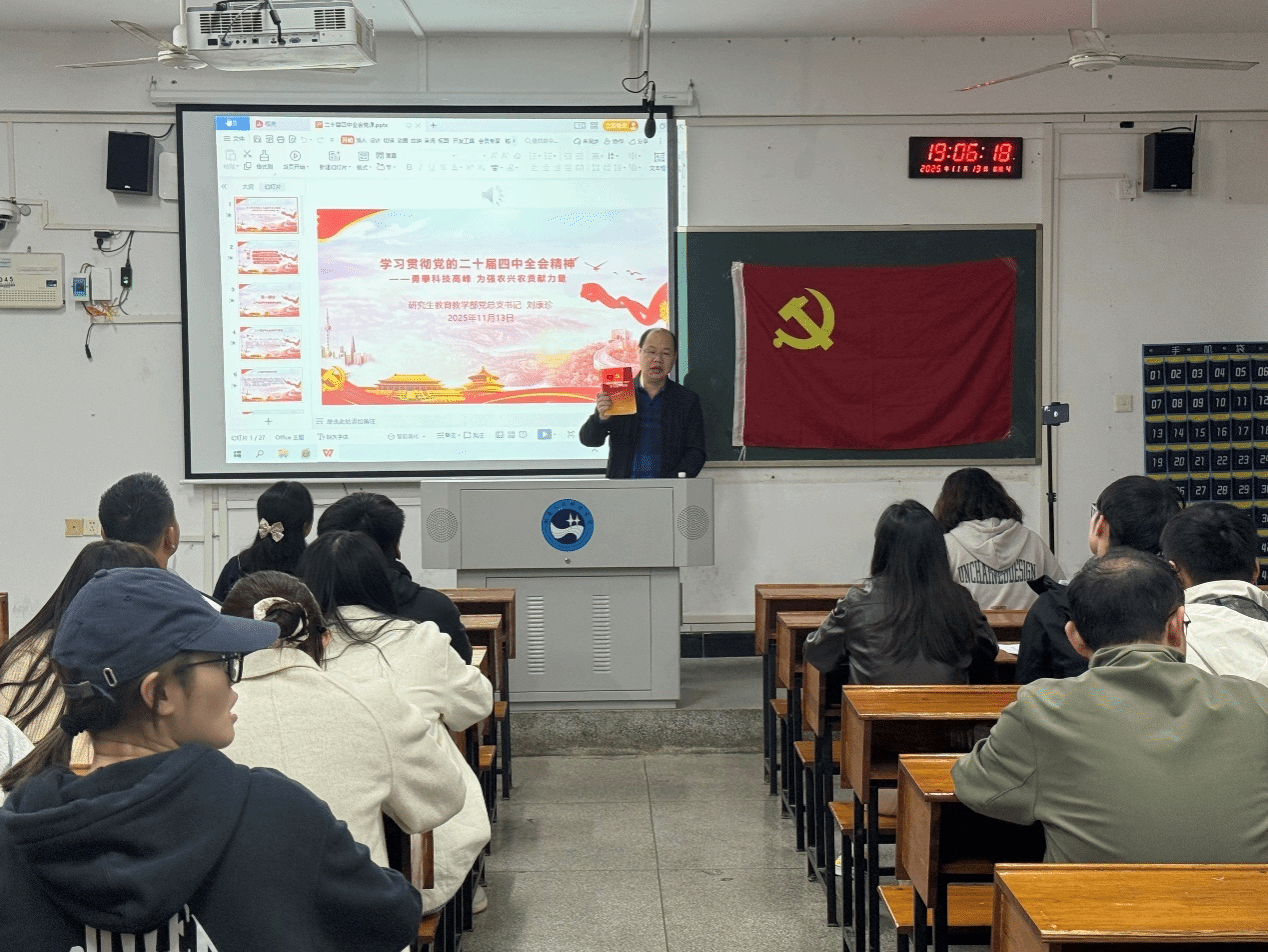 2025年11月13日,研究生教育教学部党总支全体党员在致远楼411教室召开党员大会。会议以专题党课结合政治学习的形式,强化理论武装,凝聚服务“三农”的共识。研究生教育教学部党总支书记刘康珍讲授主题党课党总支书记刘康珍以“学习贯彻党的二十届四中全会精神--勇攀科技高峰 为强农兴农贡献力量”为题讲授专题党课。他深入解读党的二十届四中全会精神,重点阐释“加快农业农村现代化”的部署要求,结合我国农业科技进步贡献率达63....